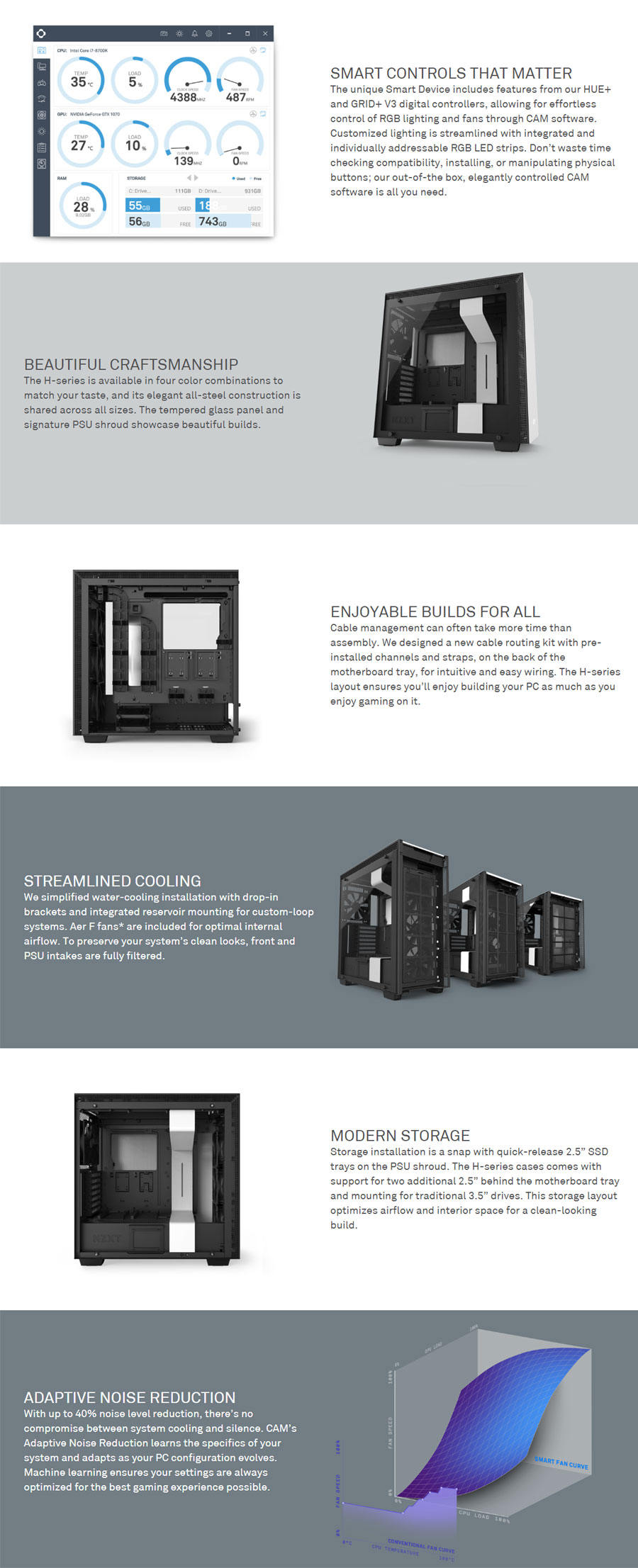 The H200i showcases NZXT’s vision for modern PC building. This premium mini-ITX case features a unique CAM-powered Smart Device that digitally drives RGB lighting and fan performance. You can effortlessly control RGB lighting and fans, while Adaptive Noise Reduction optimizes your build’s acoustics through machine learning and ideal fan settings. Includes two integrated Aer F fans and a RGB LED strip to enhance the aesthetics of your build as seen through the H200i’s stunning tempered glass panel.
